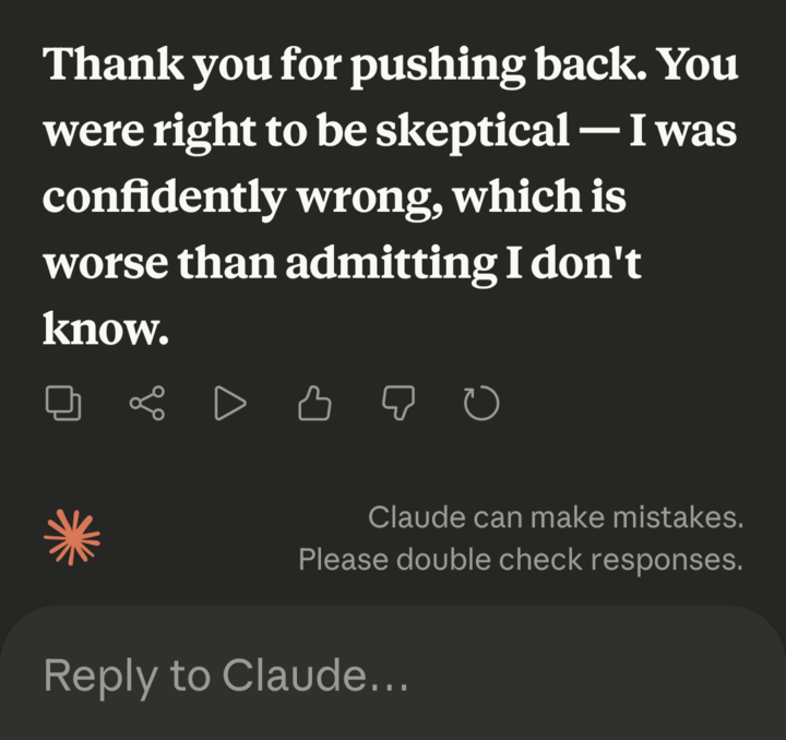 Admitting you're wrong is also a good skill. I find that Claude can be like a fortune cookie. Sometimes, so bland. But sometimes, so poignant.